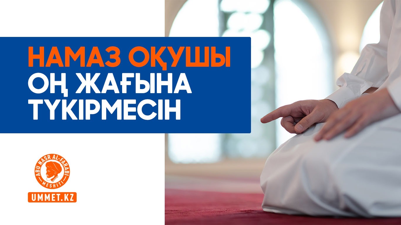 Қатада (р.а.) айтты: «Пайғамбарымыз (с.ғ.с.): «Мүъмин кісі намаз оқып жатқанда Раббысымен сөйлеседі (оған мінәжәт етеді), сол себепті алдына және оң жағына мүлде түкірмесін, сол жағына немесе аяғының астына түкірсін!»,- деді.
