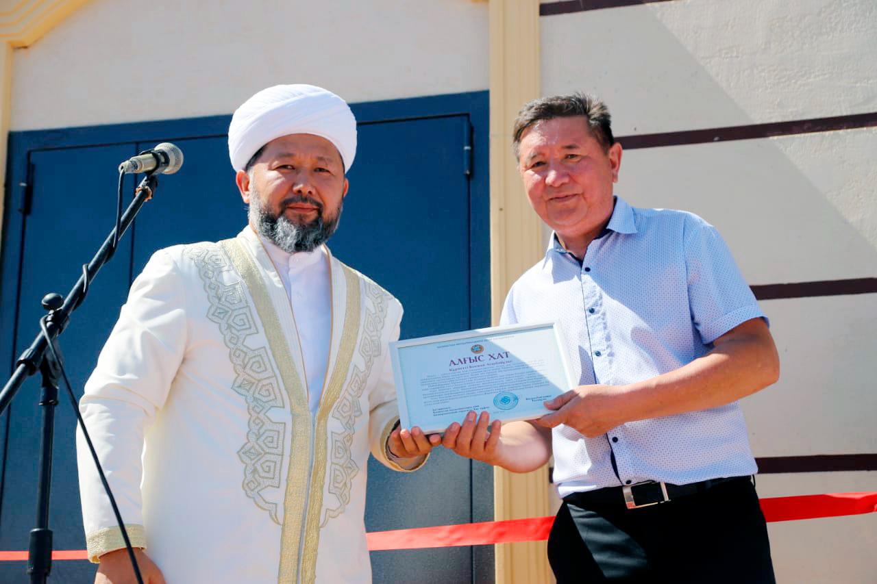 Бас мүфти құттықтау сөзінде мешіт салуға ұйытқы болған Қазақстанның еңбек сіңірген қайраткері Бекжан Тұрысқа алғысын білдіріп, жылы лебізін жеткізіп, алғыс хатпен марапаттады.